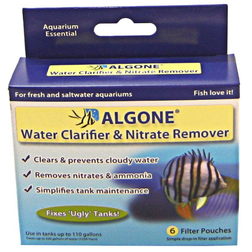 Algone Water Clarifier and Nitrate Remover cleans your aquarium in no time! Algone Water Clarifier and Nitrate Remover cleans aquarium water while issuing no harmful effects aquatic plants or fish.