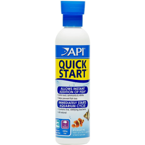 API Quick Start features a unique nitrifiying bacteria that consumes ammonia and nitrite to prevent "new tank syndrome." Quick Start allows for the immediate addition of fish to a new freshwater or saltwater aquarium. By limiting the amount of toxic ammonia and nitrite, Quick Start helps keep your fish healthy and alive.