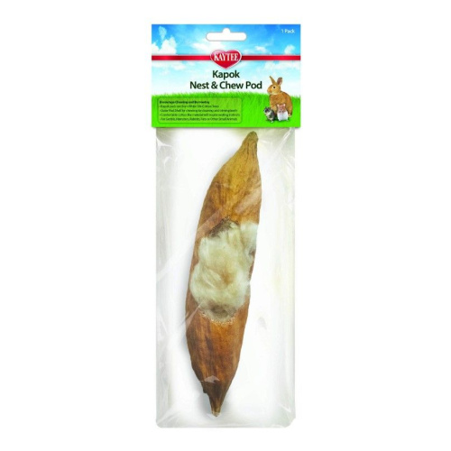 Kaytee Kapok Nest and Chew Pods are made with all natural material from white silk-cotton trees. The outer shell is a natural chew source a soft, cotton-like filling that makes an excellent nesting material for a variety of small pets. Kapok Pods are an excellent option for encouraging natural foraging and nesting behaviors.