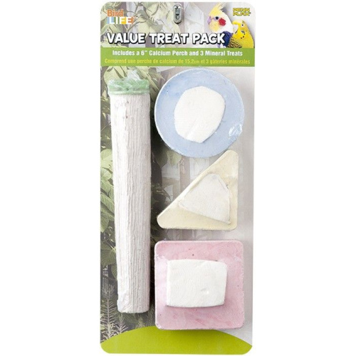 The Bird Life Value Treat Pack by Penn Plax includes a 6" calcium perch and 3 mineral cuttlebone treats, all of which naturally trim the nails and beak with regular use. These treats are an excellent source of calcium and iodine, which are essential trace elements for your birds bone and overall health.