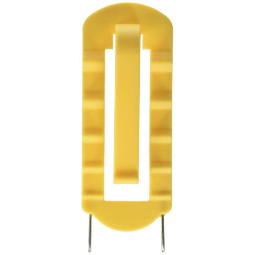 Birdie Basics Cuttlebone & Treat Holder. One-size-fits-all yellow plastic holder hangs easily from any horizontal cage wire. Can be used for millet, pieces of fruits or vegetables and all sizes of cuttlebones.