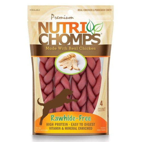 Premium Nutri Chomps Chicken Flavor BraidsPremium Nutri Chomps Chicken Flavor Braids are rawhide-free dog chews made with real, oven-baked chicken and pork skin. Nutri Chomps chews are completely edible and fortified with essential vitamins and minerals, with a tough braid shape that provides dogs with a satisfying chewing challenge.