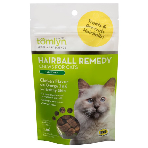 Tomlyn Hairball Remedy Chews for CatsTomlyn Hairball Remedy Laxatone Chews gently eliminate and prevent the formation of hairballs. Made with mineral oil, soy lecithin, canola oil, and Aloe Vera gel, these soft treats lubricate ingested hair so that it passes safely through the digestive tract. Cats love the soft texture and chicken flavor.